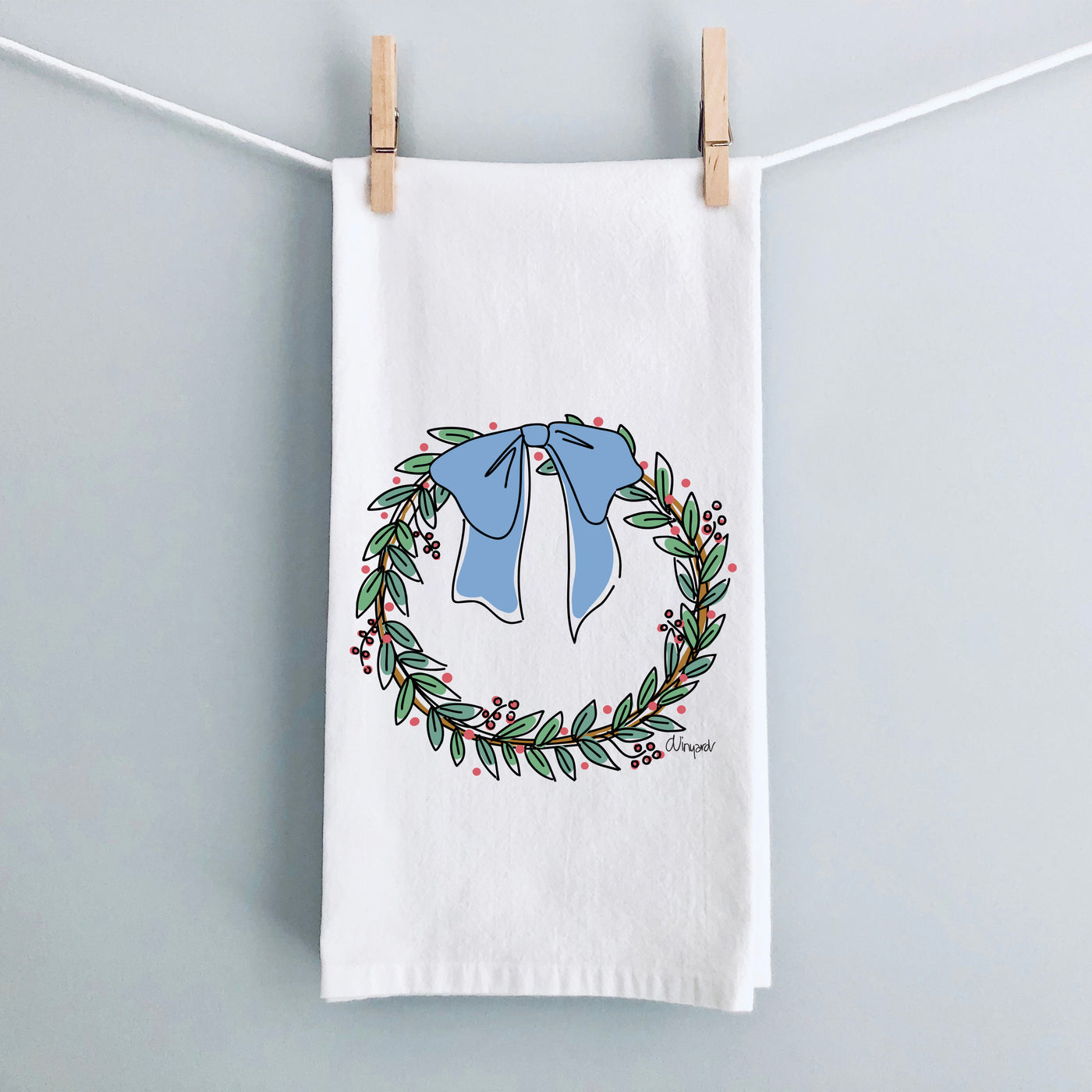 Brighten your kitchen for the winter season and beyond with this fresh botanical wreath design! Slim green leaves and red berries form the wreath, with playful pops of red scattered throughout, and a charming French blue bow for a cheerful touch that works beautifully past the holidays.